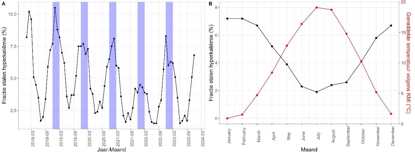 Figuur 3 A) De fractie stalen met hyperkaliëmie (kalium >5.5 mmol/L) piekt telkens tijdens de wintermaanden (blauwe achtergrond). B) Er is een inverse relatie tussen de gemiddelde buitentemperatuur (rood) en de fractie hyperkalemische stalen (zwart). Dit staat los van hemolyse (de grafieken zijn identiek bij exclusie van hemolytische stalen). Bron: analyse op eigen data van 2018-2023 (n=230.234 resultaten).