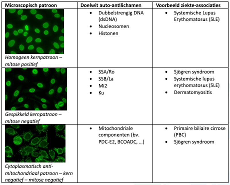 Tabel 1: enkele voorbeelden van microscopische patronen, de mogelijke oorzakelijke antilichamen en geassocieerde ziektes. Bron foto’s: https://www.anapatterns.org