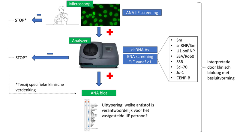 Bij positieve screening op IIF wordt vervolgens een uitwerking gedaan om te bepalen over welk auto-antilichaam het juist gaat. Hierbij gebeurt er eerst een zogenaamde “ENA screen” (Extractable Nuclear Antigen) die verschillende celcomponenten bevat alsook (bij titer ≥1/160) een bepaling van antistoffen tegen dubbelstrengig DNA (anti-dsDNA), courant gevonden bij SLE. Als ≥1 van deze testen positief is gebeurt verdere uitwerking via een confirmatietest (immunoblot). De volledige flow wordt visueel voorgesteld in Figuur 1.