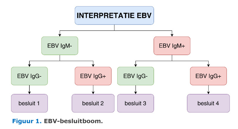 Laten we voor ons praktisch voorbeeld aannemen dat u EBV IgM en IgG antistoffen aangevraagd hebt. In dit scenario zal er automatisch een standaard interpretatie toegevoegd worden op basis van de EBV-besluitboom (zie Figuur 1).