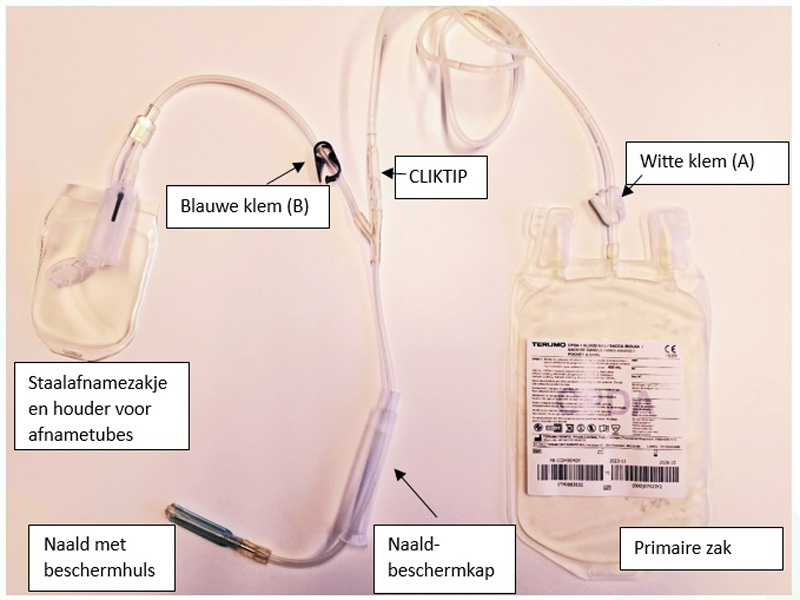 - Sluit de witte klem (A) op de donorslang en de blauwe klem (B) op de afnameslang aan het staalafnamezakje.